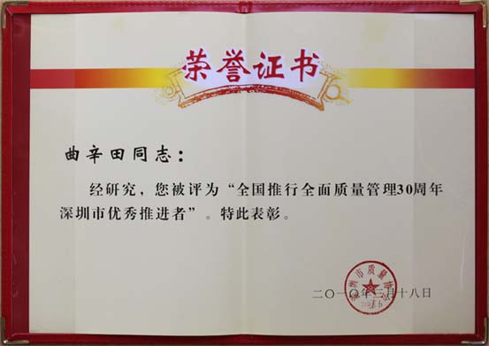 我中心曲辛田董事长获荣誉证书