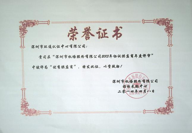 年协议供应商年度评审”中被评为“优秀供应商”,在此对深圳机场给予的支持与信任表示衷心的感谢。